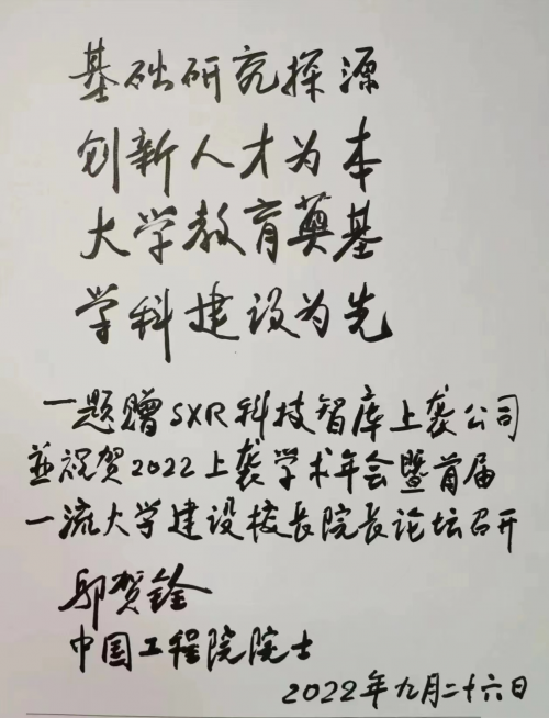 活动期间,中国工程院院士邬贺铨为SXR科技智库上袭公司成立十五周年题词:科技向上,创新逆袭,并为首届上袭学术年会召开题词:基础研究探源,创新人才为本,大学教育奠基,学科建设为先。