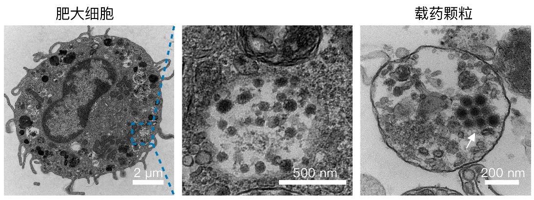 装载溶瘤病毒的肥大细胞透射电镜图片(左);细胞内部含有溶瘤病毒的颗粒的放大图(中);经脱颗粒释放到胞外的含有溶瘤病毒的颗粒透射电镜图(右)。科研团队供图
