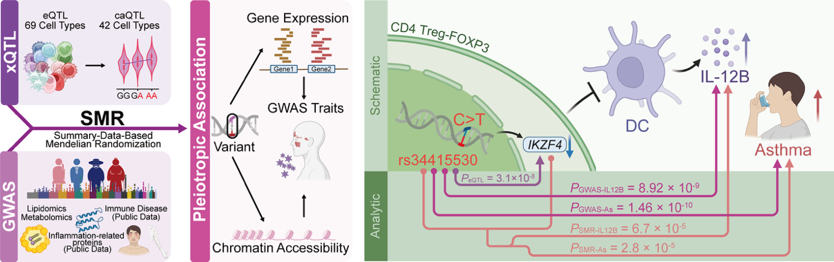 研究团队整合了154种分子和疾病性状的数据,在68种免疫细胞中发现了1196个显著的遗传关联。以哮喘为例,研究揭示了一个关键变异如何在特定的调节性T细胞中调控某个基因的表达,进而影响炎症因子水平,最终提高个体的哮喘风险。这一发现不仅解释了该位点影响哮喘易感性的机制,也为未来开发精准治疗策略提供了方向。