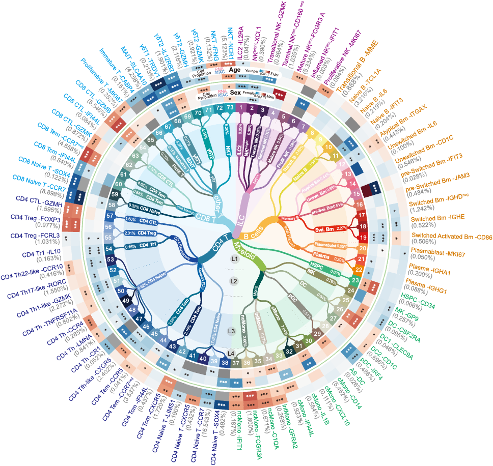 研究团队还为每种细胞建立了详细的“身份证”,记录了它们的分布及基因表达特征,并且结合了志愿者的生理数据,探索了年龄和性别等因素与特定免疫细胞特征的关联。