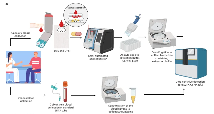 研究团队此次测试了一种检测阿尔茨海默病的新方法。该方法只需采集几滴指尖血液,并置于卡片上干燥即可。团队将该方法应用于337名受试者,以检测与阿尔茨海默病有关的蛋白和大脑的其他变化。