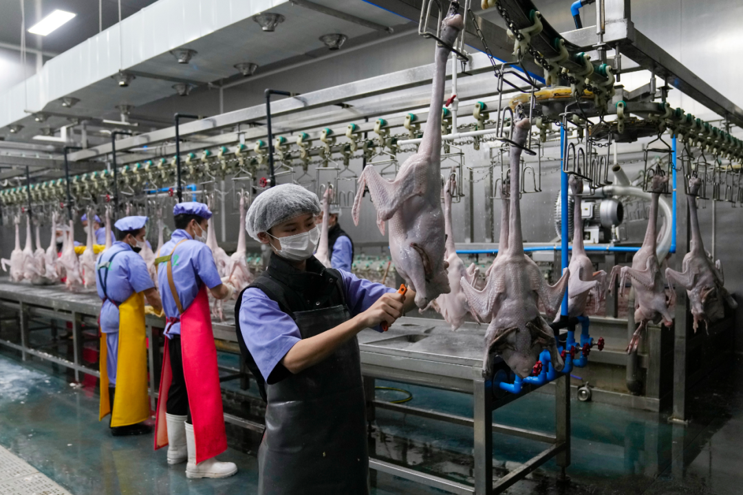 在粤鹅皇公司现代化屠宰车间内,38℃恒温水浴褪毛、红外扫描动态称重、AI视觉瑕疵检测等智能工序有序推进,悬挂式传送带高效运转,一只只肉鹅有序通过各道智能工序。