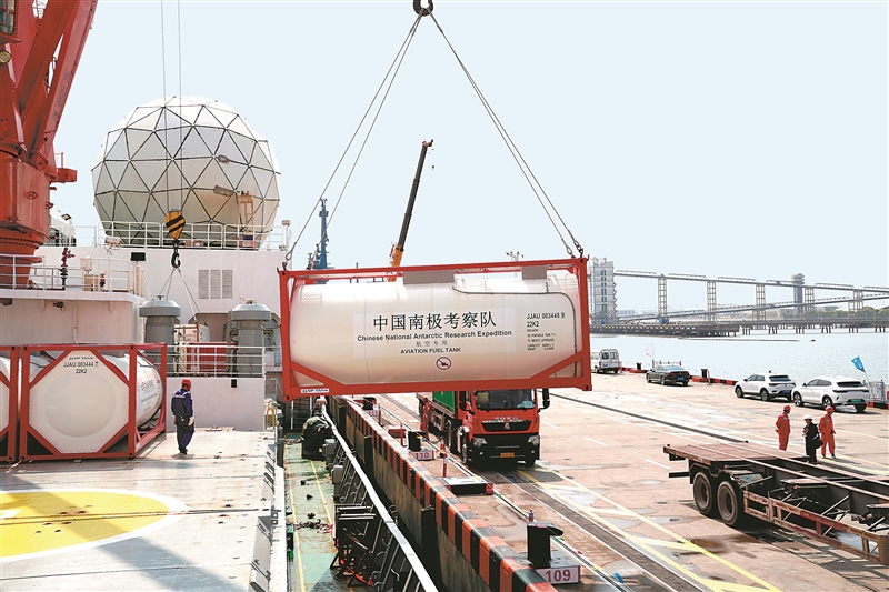 4月9日,工作人员操作机械从“雪龙”号上卸货。新华社记者 张建松摄