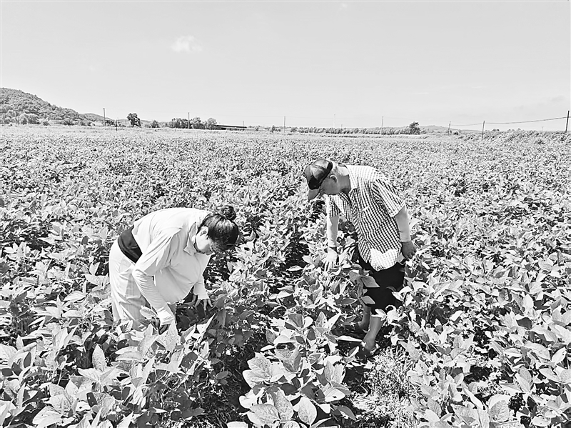 辽宁省大连市庄河市现代农业生产发展服务中心专家在庄河市大郑镇东岭村进行大豆长势调查。受访单位供图