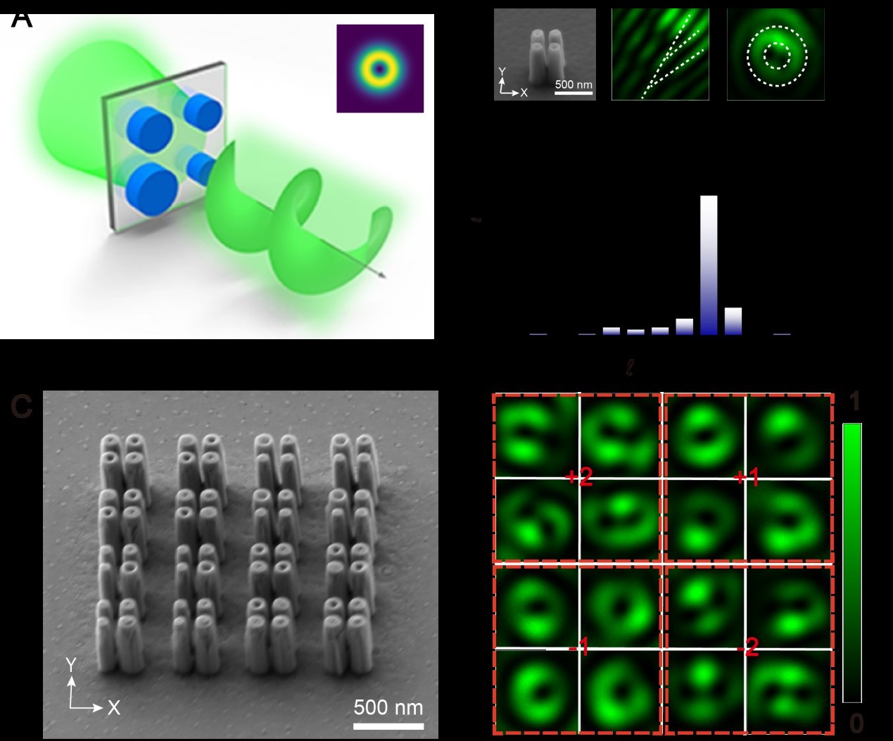 实验过程中,科研团队利用间隙相位提供的额外光场调控能力,使用仅包含4个纳米柱的超构四聚体,实现连续涡旋相位,同时实现并验证具有高效率、高纯度、拓扑荷数的涡旋光束。